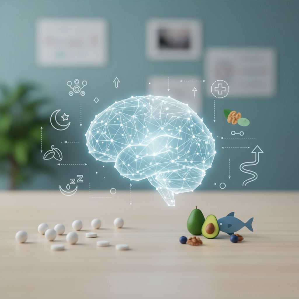 Ne mažiau svarbi yra mityba, praturtinta smegenims būtinomis medžiagomis. Omega-3 riebalų rūgštys, randamos riebiose žuvyse (lašišoje, skumbrėje, sardinėse), linų sėmenyse ir graikiniuose riešutuose, yra esminis smegenų ląstelių membranų statybinis elementas. Taip pat smegenų funkcijai itin svarbūs B grupės vitaminai, antioksidantai ir cholino šaltiniai (pavyzdžiui, kiaušinių tryniai), kurie sinergiškai papildo vaistų veikimą ir užtikrina sklandžią acetilcholino gamybą.